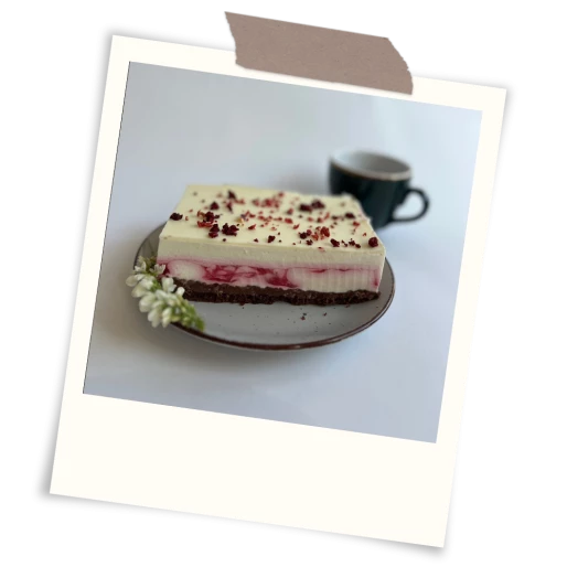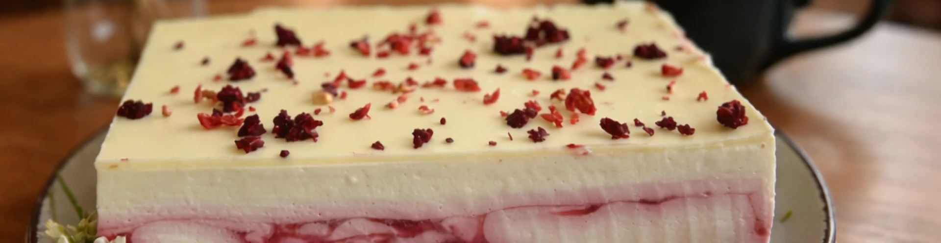 Po schłodzeniu podgrzewamy delikatnie Cover Cream White Alfapro, dodajemy olej, mieszamy i wylewamy na powierzchnię ciasta. Przed zastygnięciem posypujemy całość wiśnią liofilizowaną.