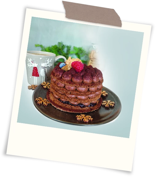 Mleko, jaja i Piernik Mistrzów mieszamy ze sobą na wolnych obrotach przez około minutę. Wykładamy na blaszkę z papierem, smarujemy cienki blat i odpiekamy w temperaturze około 23 stopni Celsjusza 10 – 12 min. Po ostudzeniu, wycinamy krążki metalowym ringiem o średnicy ok. 15 cm. Pierwszy spód smarujemy czarną porzeczką prażoną AlfaPro, wymieszaną z żelatyną.